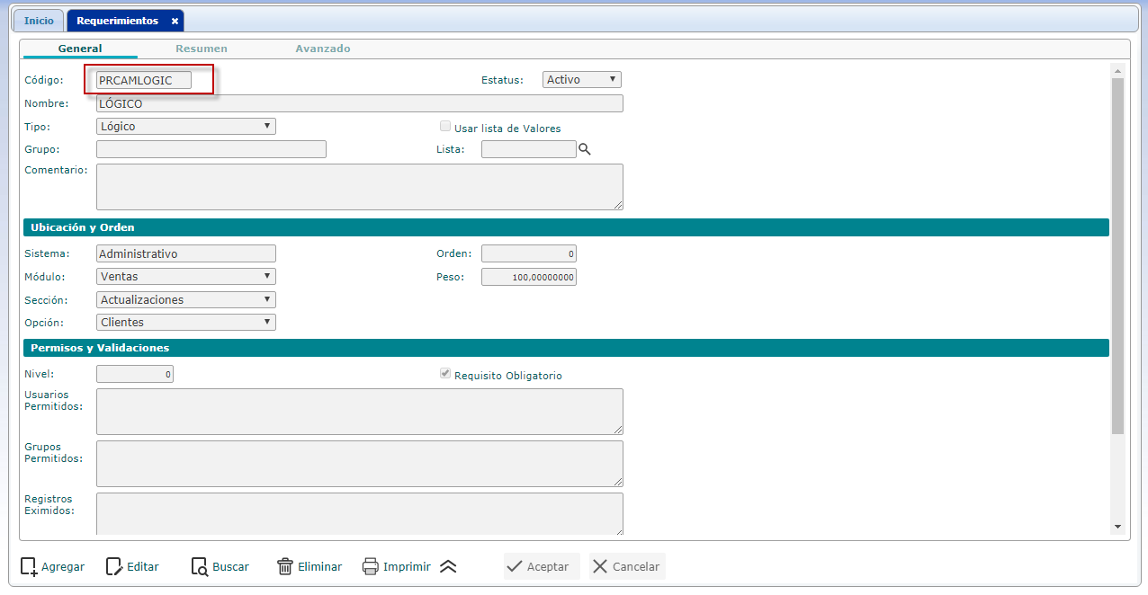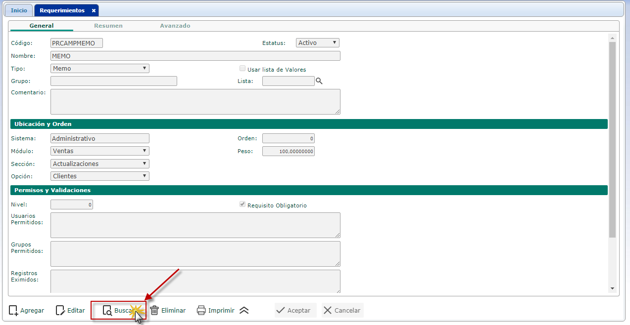 Búsqueda de Registros: Requerimientos donde se debe colocar el Código o Nombre del buscado y se procede a presionar el botón