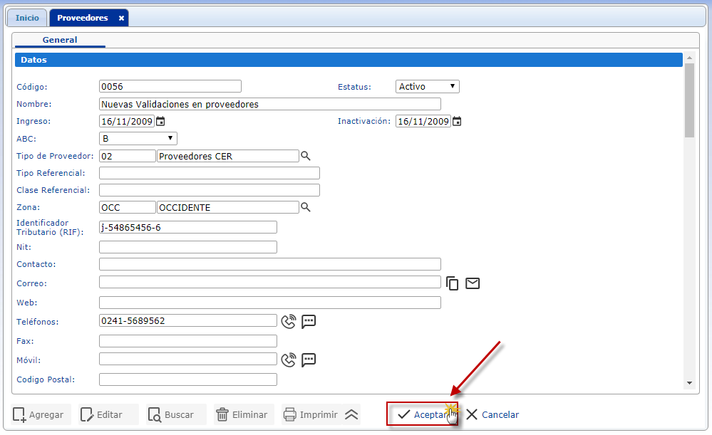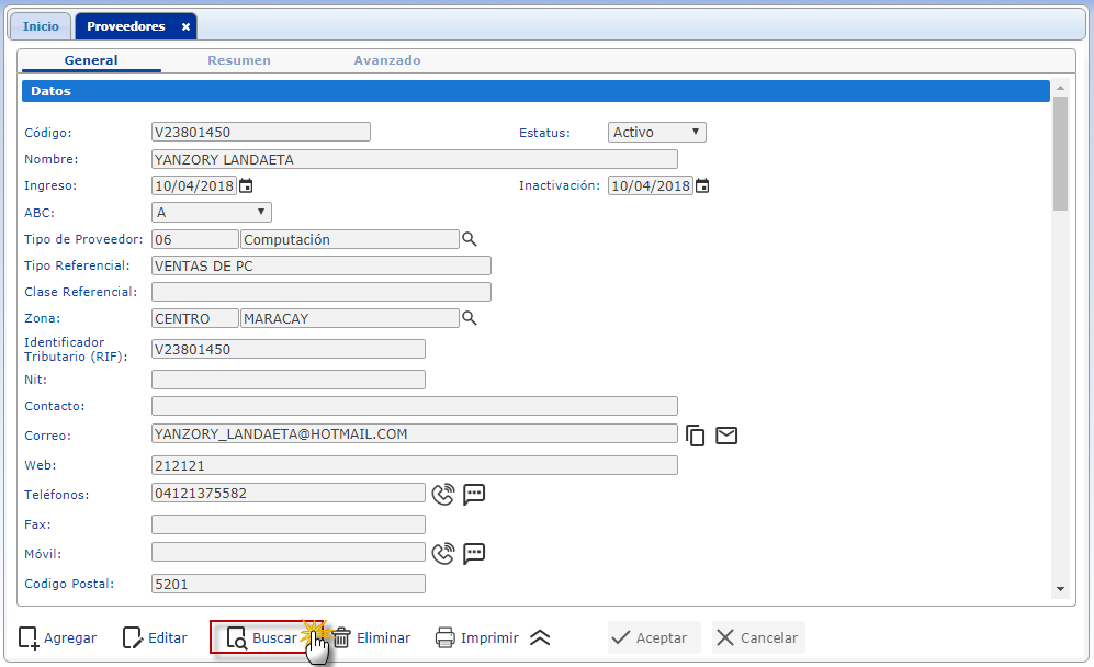 d. Luego se muestra en la pantalla la ficha de datos del proveedor buscado el cual podemos actualizar cómodamente los datos del proveedor y para finalizar seleccionaremos el botón