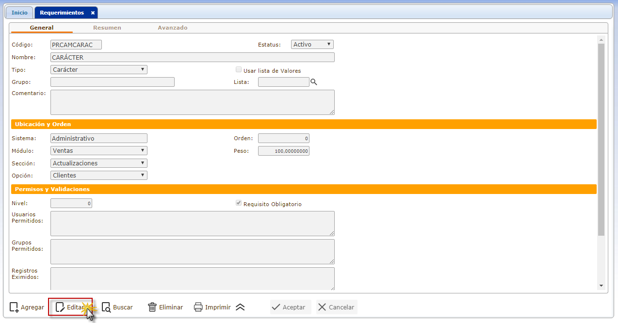 b. En el módulo MP, desplegamos el componente Actualizaciones y activamos el sub. componente Requerimientos.