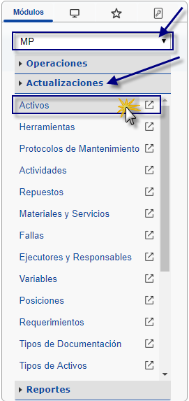 b. En el módulo MP, desplegamos el componente Actualizaciones y activamos el sub. componente Activos.