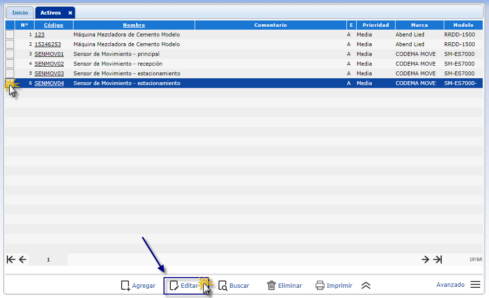que se encuentra ubicado a la izquierda del activo para poder seleccionar el activo a editar. Después presionaremos el botón