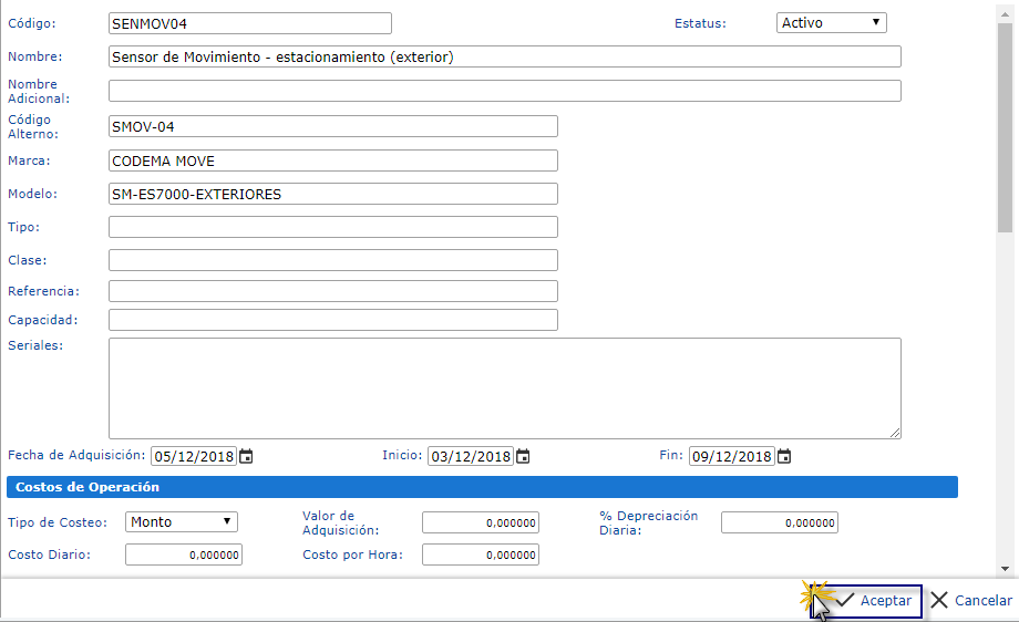 , se nos muestra la ventana de activos donde podemos editar la información del activo. Luego presionaremos el botón
