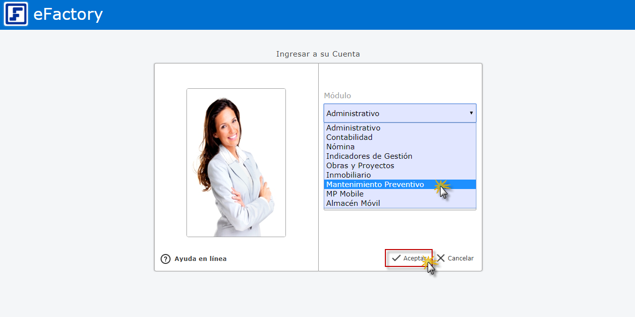 a. Al iniciar eFactory con nuestro Usuario y Contraseña, Seleccionamos el Módulo