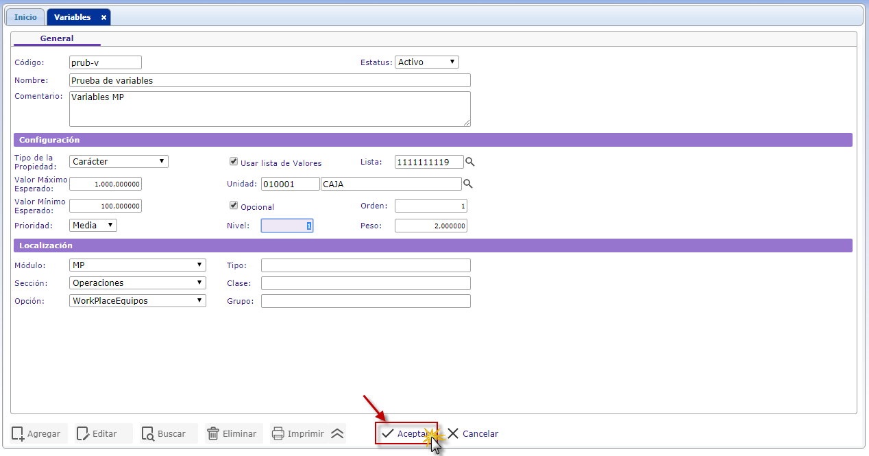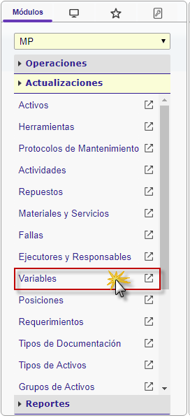 b. En el módulo MP, desplegamos el componente Actualizaciones y activamos el sub. componente Variables.