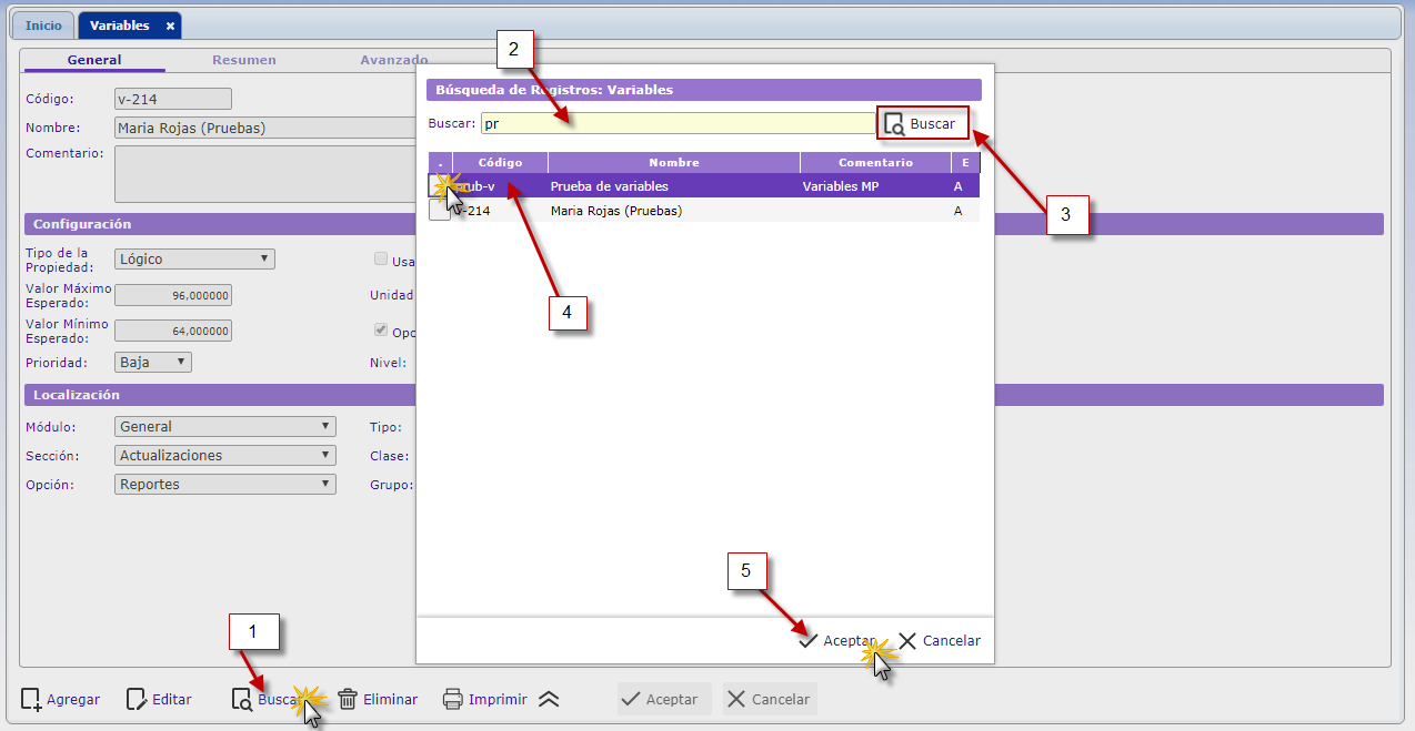 luego se nos muestra la ventana de Búsqueda de Registros: Variables donde colocaremos en buscar el nombre de la variable correspondiente a editar
