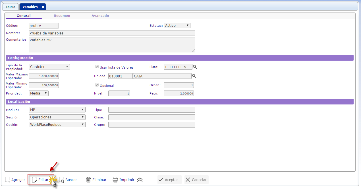 , donde se muestra la ventana de la variable buscada la cual se procede a editar la información.