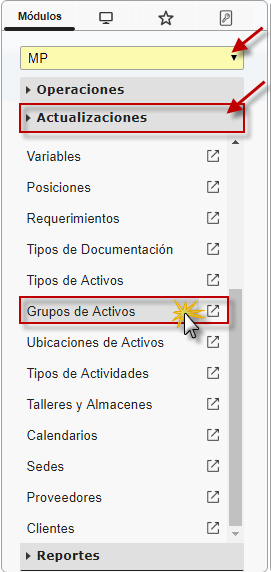 b. En el módulo MP, desplegamos el componente Actualizaciones y activamos el sub. componente Grupos de Activos.