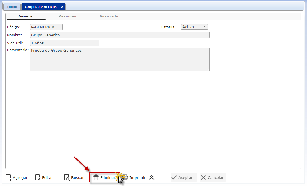 Nota: Para eliminar se debe buscar un grupo de activo, en Tema Relacionado podemos encontrar una ayuda de como buscar un grupo de activo.