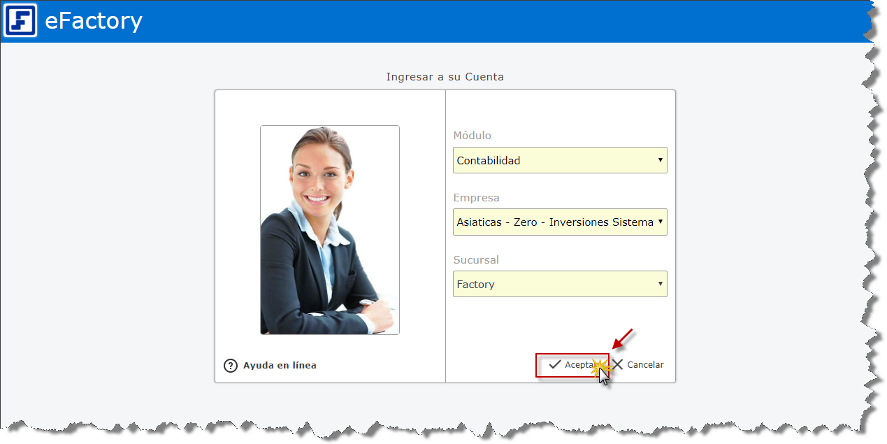 Primero debemos ingresar al sistema de contabilidad de eFactory colocando nuestro usuario y contraseña en la pantalla inicial de eFactory, luego presionaremos el botón de "Iniciar Sesión" y seleccionaremos el sistema de "Contabilidad" Empresa y Sucursal de la Empresa y seleccionaremos el botón