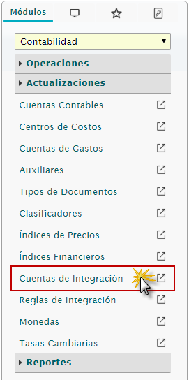 a. Al ingresar en el sistema debemos seleccionar el módulo "Contabilidad" y al desplegar la sección de "Actualizaciones" seleccionaremos la opción de Cuentas de Integración.