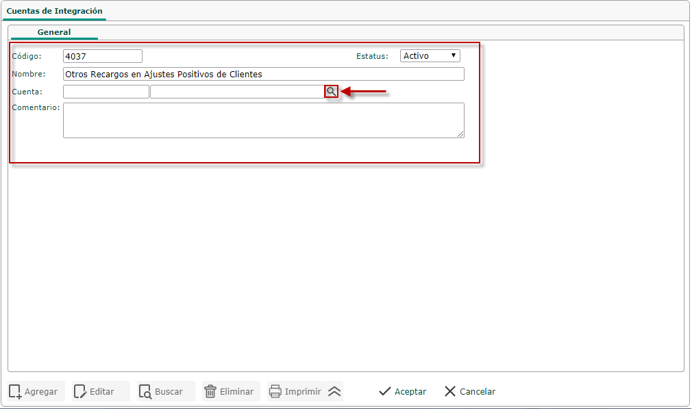 c. Luego debemos colocar en Buscar la cuenta de integración que deseemos asignar a la cuenta contable, después seleccionaremos el