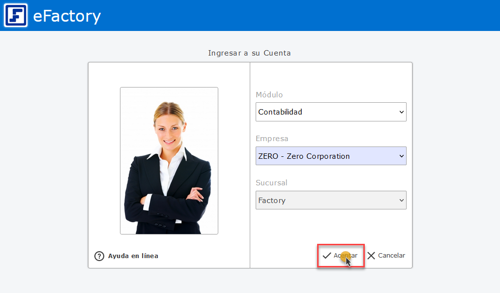 Primero debemos ingresar al sistema de Contabilidad de eFactory colocando nuestro usuario y contraseña en la pantalla inicial de eFactory, luego presionaremos el botón de
