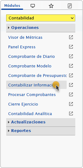 a. Al ingresar en el sistema debemos seleccionar el módulo Contabilidad y al desplegar la sección de Operaciones seleccionaremos la opción de Contabilizar Información.