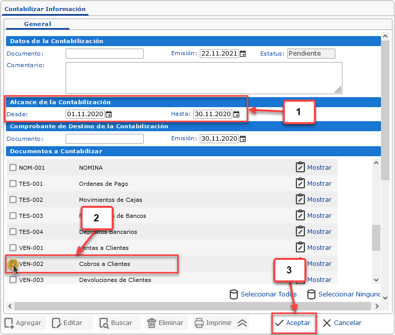 b. Despues de hacer clic en en el botón Agregar, debemos indicar las fechas de alcance de la contabilización, seleccionar el tipo de documento Cobros a Clientes