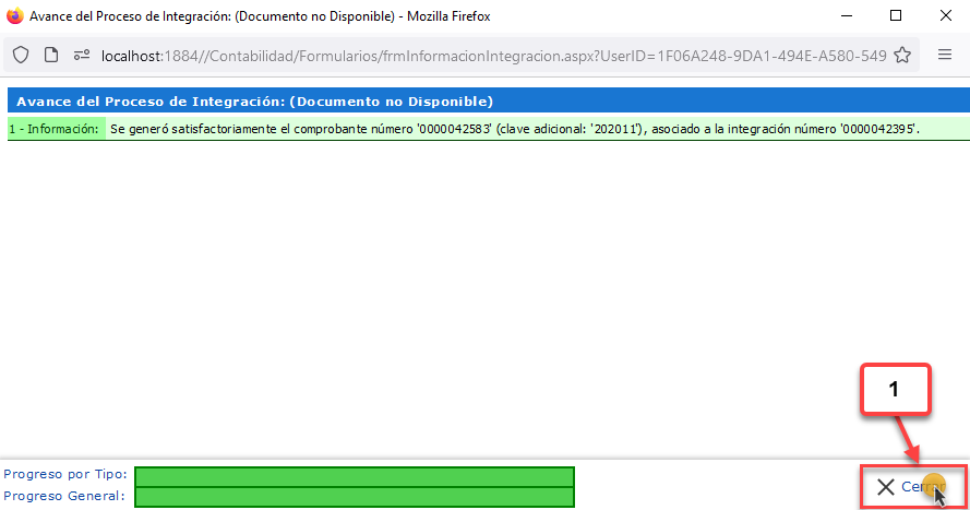 se mostrará la ventana de Avance del Proceso de Integración.