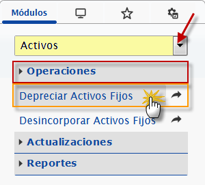 a. Debemos seleccionar el módulo "Activos" y al desplegar la sección de "Operaciones" seleccionaremos la opción de Depreciar Activos Fijos.