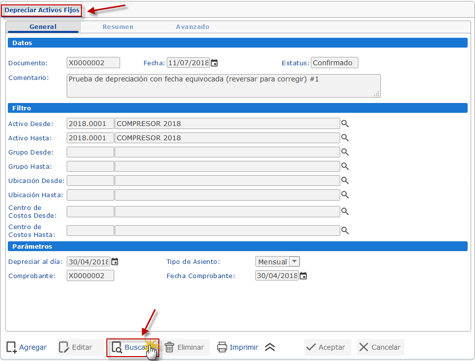 , donde buscaremos la depreciación de activos fijos que deseamos corregir.