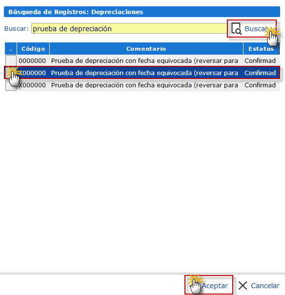 y buscaremos la depreciación que deseamos corregir la seleccionamos y presionaremos el botón