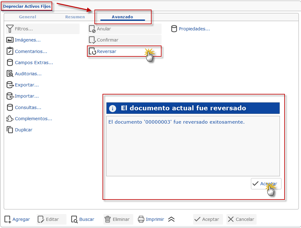NOTA: Si se presenta doble contabilización de Depreciaciones de activos fijos, debemos primero reversar la ultima Depreciación y luego la anterior.