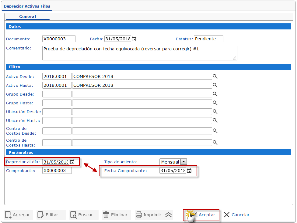 NOTA: Para poder corregir una depreciación de activo fijo este deberá tener un monto de adquisición o la fecha de adquisición y valor de salvamento equivocado.