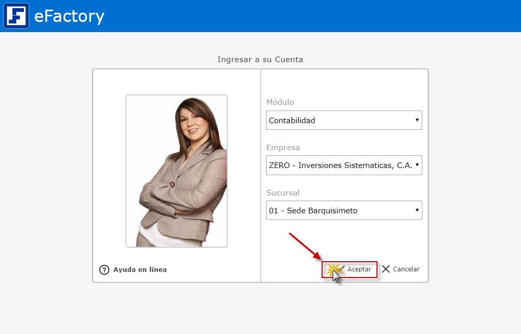 Primero debemos ingresar al sistema de contabilidad de eFactory colocando nuestro usuario y contraseña en la pantalla inicial de eFactory, luego presionaremos el botón de "Iniciar Sesión" y seleccionaremos el sistema de "Contabilidad",