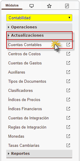 a. Debemos seleccionar el módulo "Contabilidad" y al desplegar la sección de "Operaciones" seleccionaremos la opción de Cuentas Contables.
