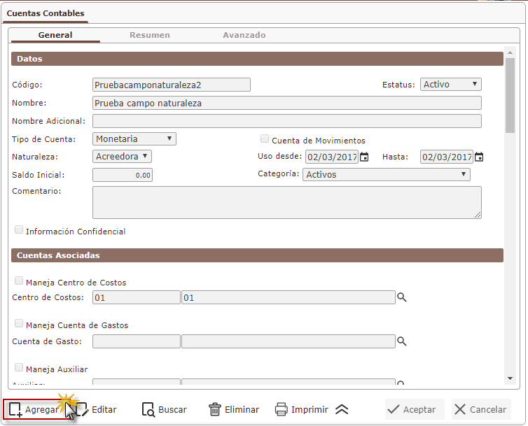 Luego de completar los campos de cuentas contables, presionaremos el botón