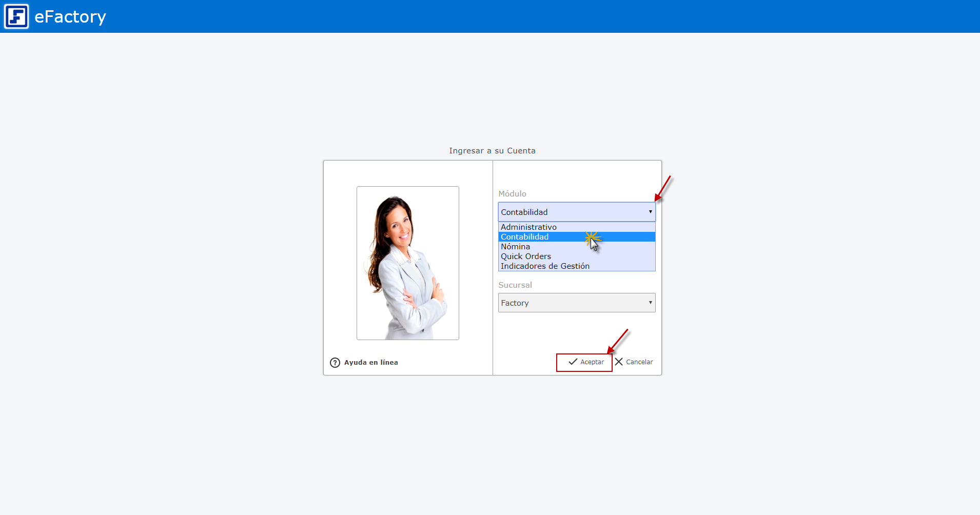 a. Para ingresar debemos iniciar en eFactory con nuestro Usuario, Contraseña y oprimiremos el botón