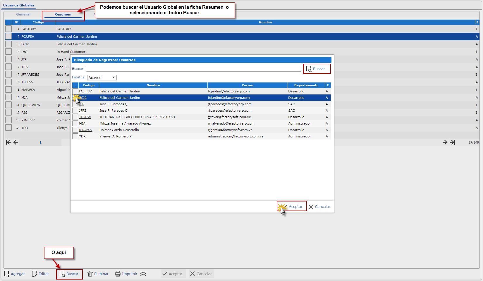 También podemos buscar el usuario en la ficha Resumen, allí observamos todos los usuarios registrado en eFcatory.