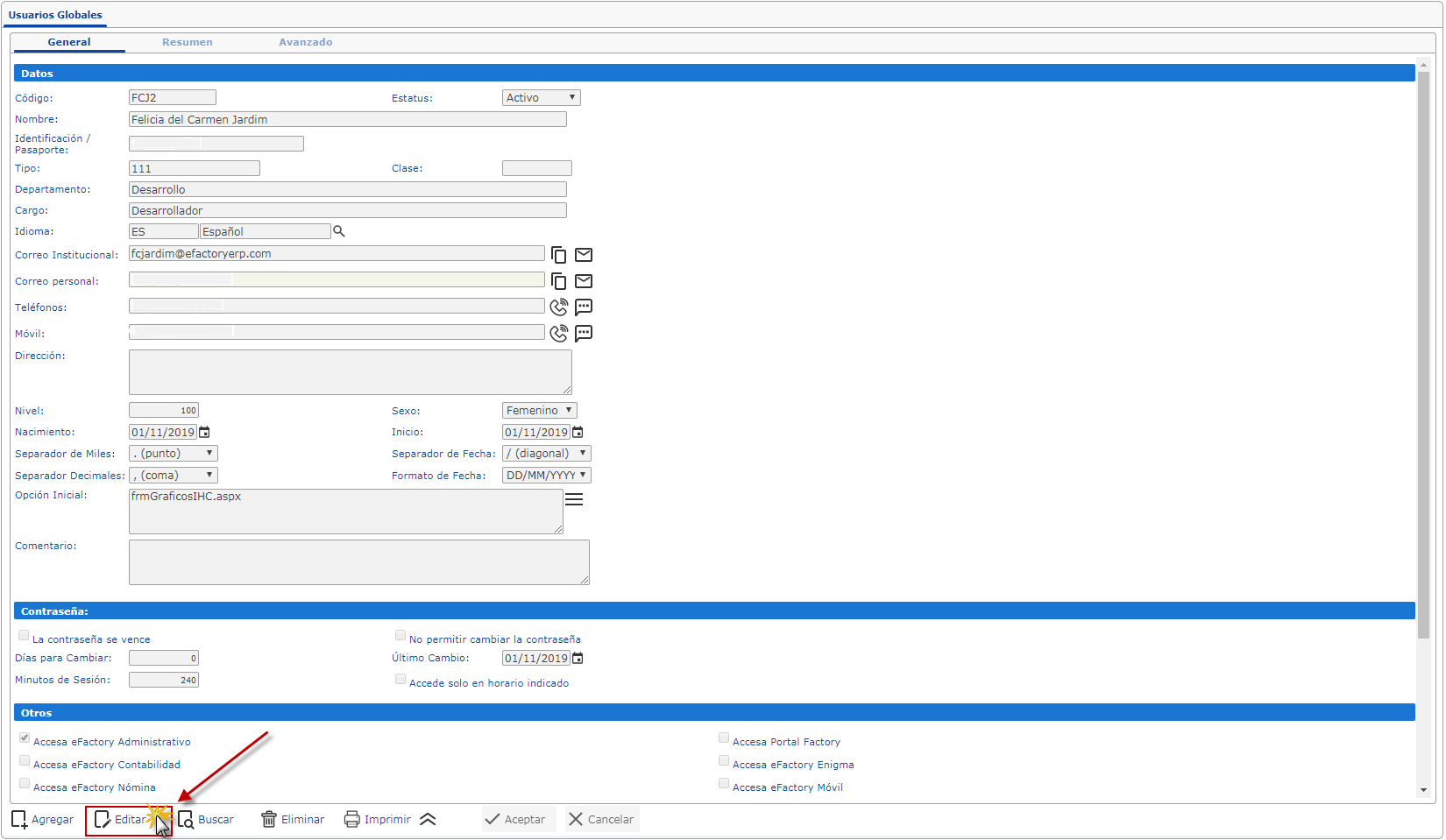 b. Luego se muestra el formulario y para darle acceso a eFactory Contabilidad nos ubicamos en la Sección Otros y marcamos la casilla de Accesa eFactory Contabilidad