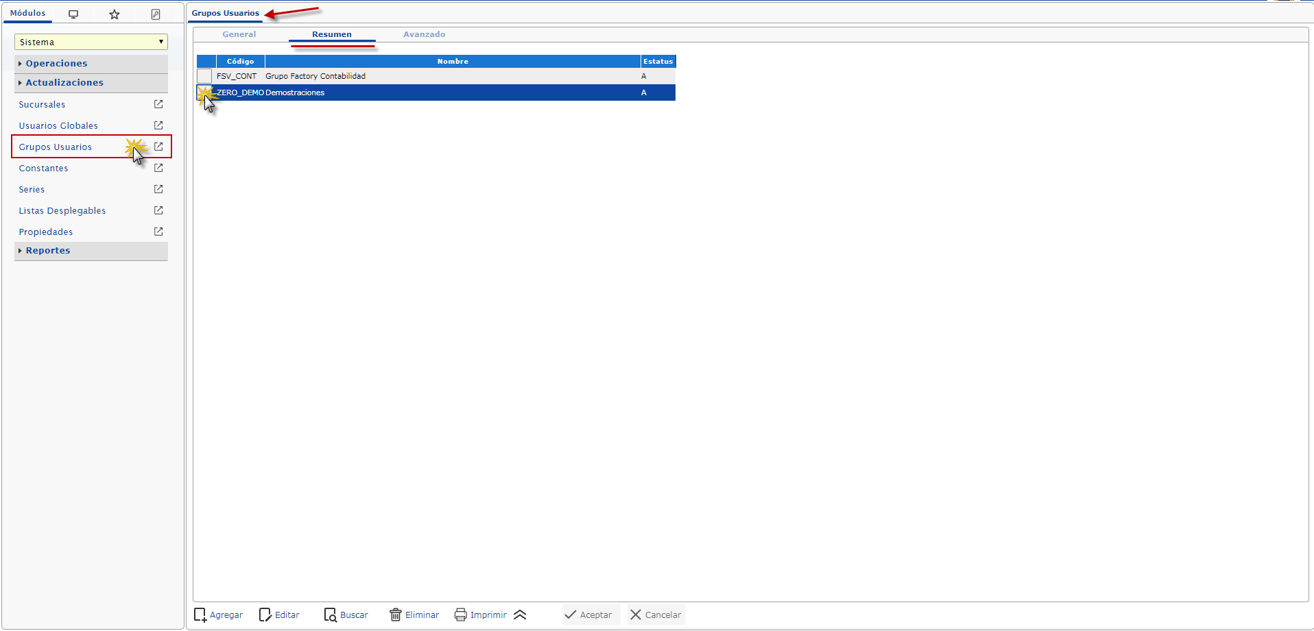 a. Para dar acceso al usuario a un grupo tenemos que ubicarnos en el menú y seleccionar el módulo de Sistema, desplegamos el componete Actualizaciones y activamos el maestro de Grupos Usuarios; Al seleccionar el maestro observamos su ventana donde seleccionaremos la ficha Resumen y buscamo el grupo al que le daremos permiso al usuario global.