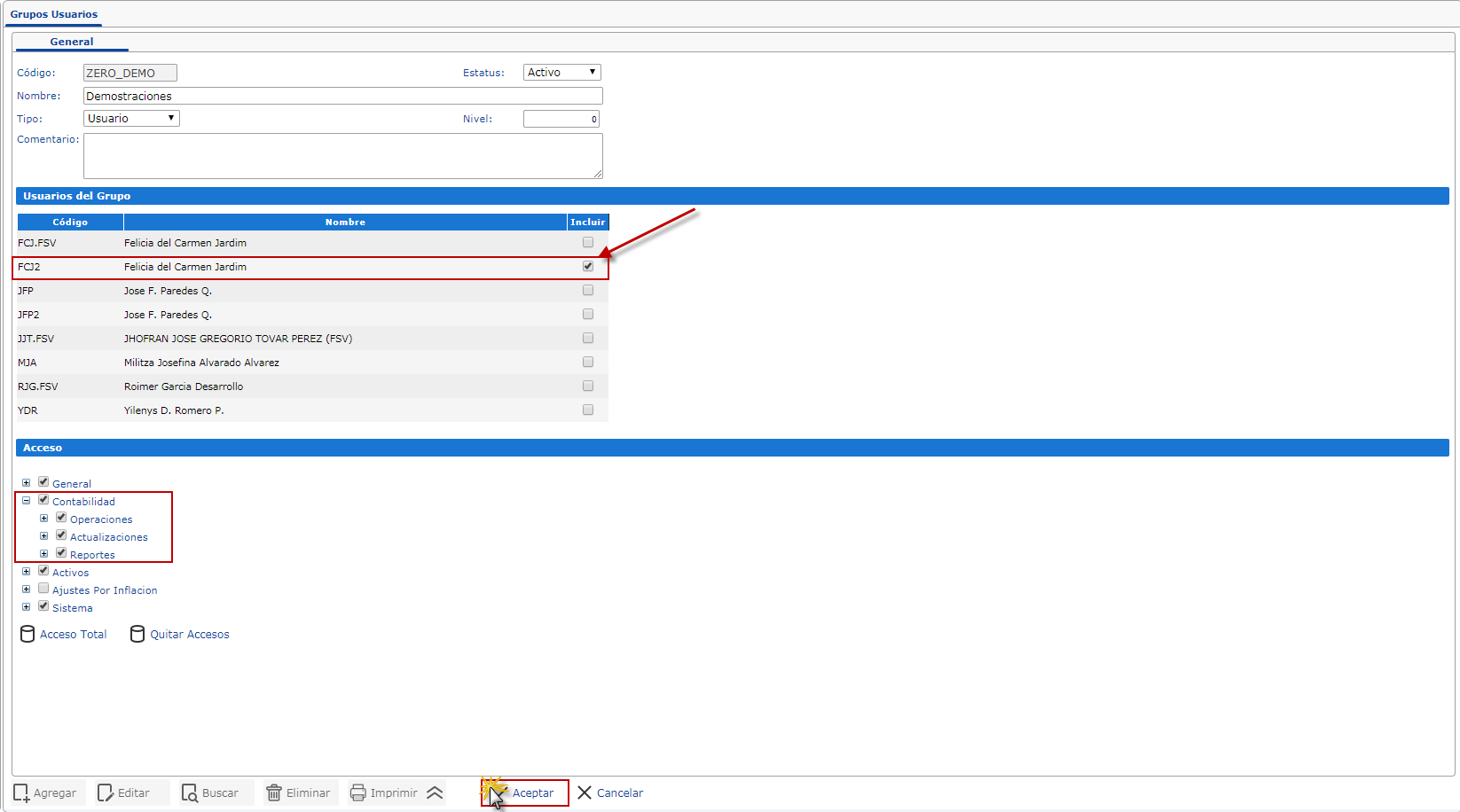nos ubicamos en la sección Acceso y seleccionaremos la casilla de acceso al módulo de contabilidad. Para finalizar oprimiremos el botón