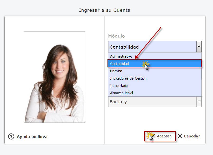 Primero deberemos ingresar a eFactory con nuestro usuario y contraseña, presionaremos "Iniciar Sesión" y luego seleccionaremos el sistema "Contabilidad", Empresa y Sucursal de la Empresa