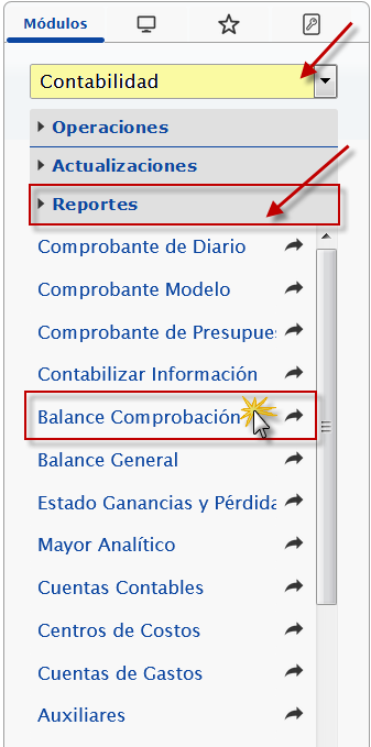 b. En el módulo Contabilidad, desplegamos el componente Reportes, activamos el sub componente Balance de Comprobación.