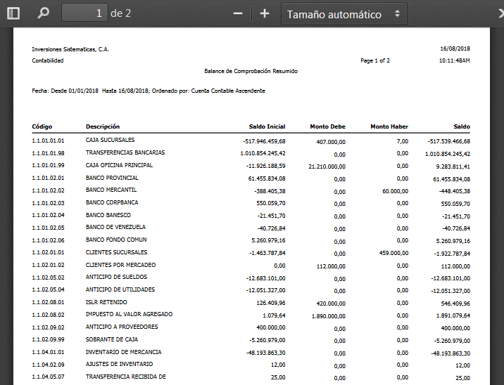 b. Revisamos en pantalla el Balance de Comprobación Resumido, el cual refleja todos los saldos deudores y acreedores, de forma compacta para una rápida visualización; posteriormente procedemos a guardarlo como un documento PDF o bien imprimirlo.