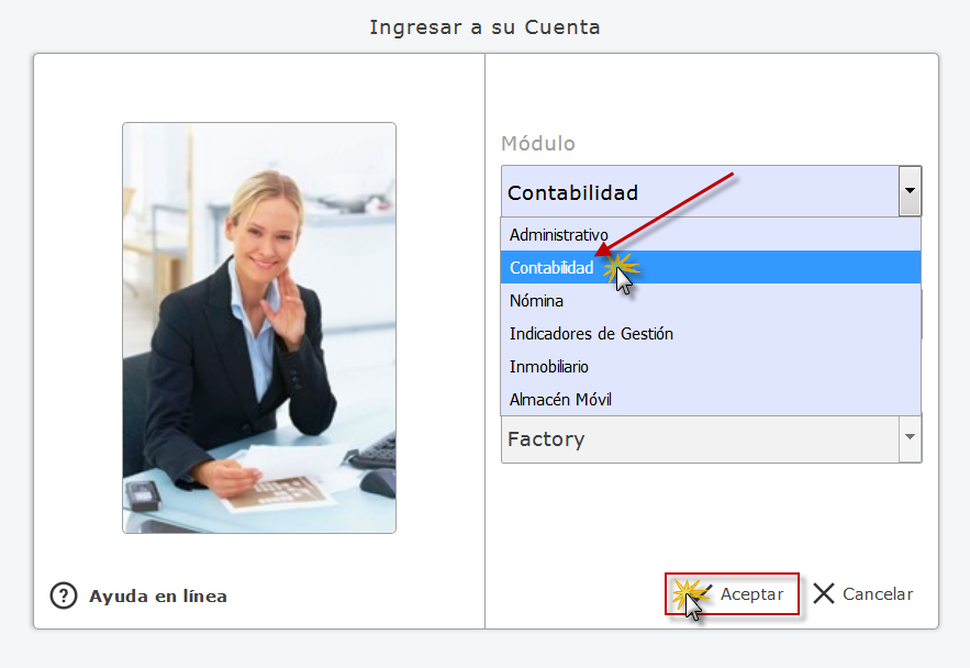 a. Al iniciar eFactory con nuestro Usuario y Contraseña, Se procede a Seleccionar el módulo Contabilidad,
