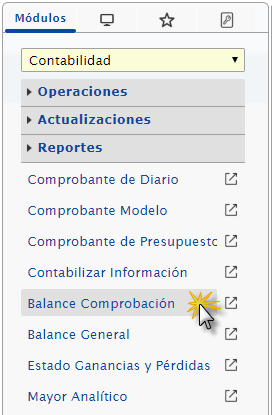 b. En el módulo Contabilidad, desplegamos el componente Reportes, activamos el sub componente Balance de Comprobación.
