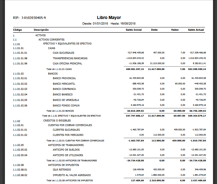 b. Revisamos en pantalla el Libro Mayor, el cual refleja todas las operaciones económicas de la Empresa, acorde con la normativa venezolana; posteriormente procedemos a guardarlo como un documento PDF o bien imprimirlo.