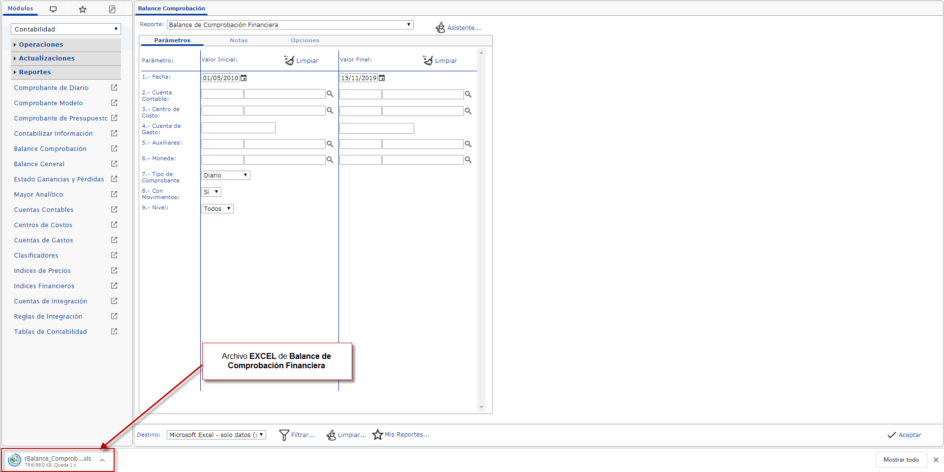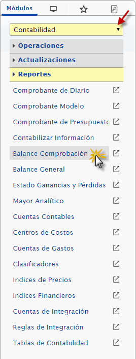 b. En el módulo Contabilidad, desplegamos el componente Reportes y activamos el sub. componente Balance de Comprobación.