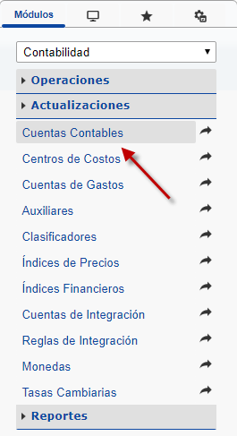 a. Primero deberemos desplegar la sección de "Actualizaciones" y seleccionaremos la opción "Cuentas Contables".