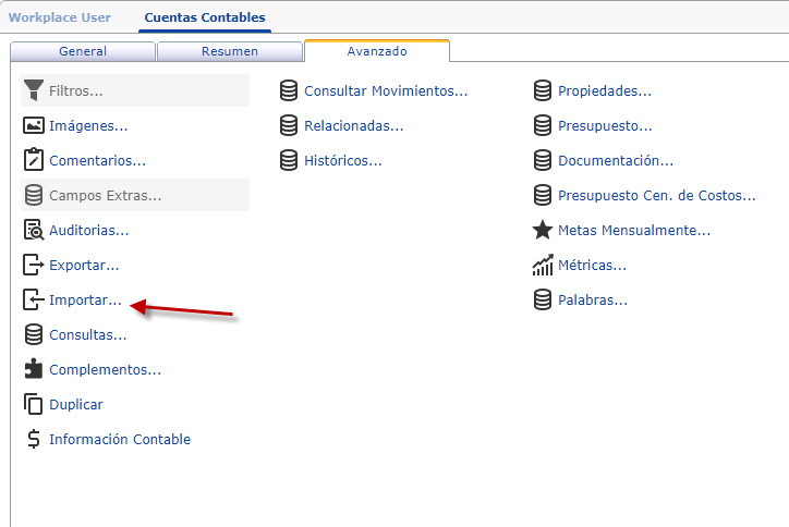 b. Se nos desplegara la pantalla de "Cuentas Contables" en ella iremos a la ficha de "Avanzado" y seleccionaremos "Exportar".