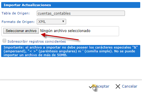 c. Se nos desplegara una ventana en la cual deberemos presionar "Seleccionar Archivo" y cargaremos el archivo que anteriormente habíamos bajado de la otra empresa. Para finalizar y cargar el archivo presionaremos