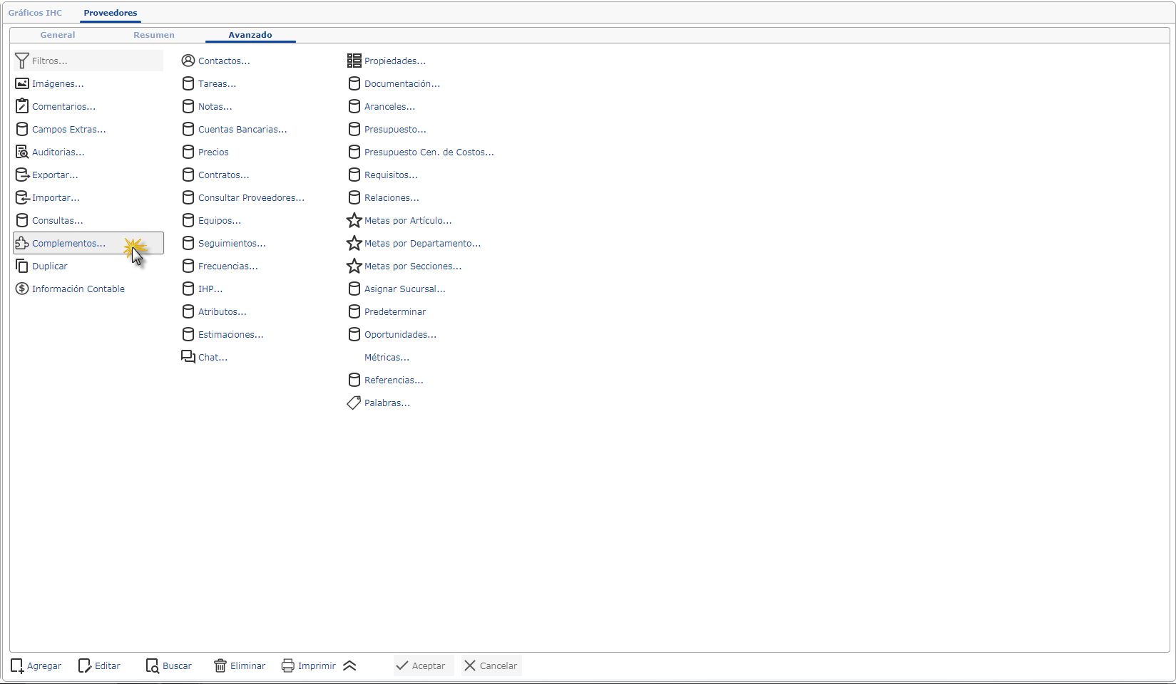 b. Luego de esto abriremos la pestaña "Avanzados" y seleccionaremos la opción "Complementos"