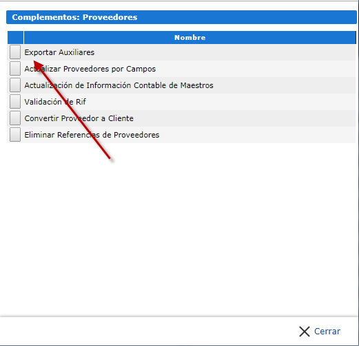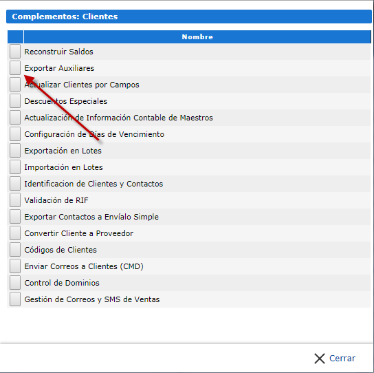 c. Se nos desplegara una ventana en ella seleccionaremos el complemento "Exportar Auxiliares" presionando la casilla que se encuentra a un costado del nombre del complemento.