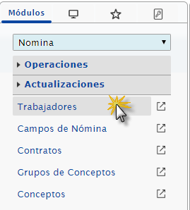 a. Una ves dentro del sistema de nómina deberemos desplegar la seccion "Actualizaciones" y seleccionar la opcion "Trabajadores"