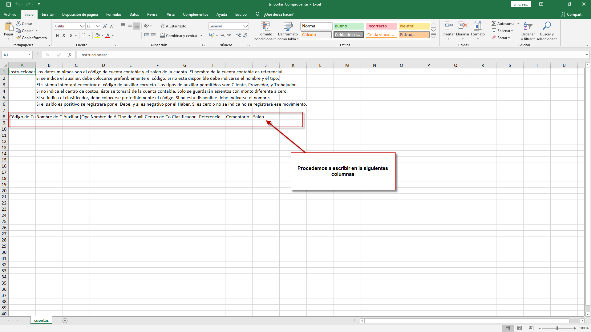 a. Ante de ingresar al sistema de eFactory para importar desde excel asientos contables debemos crear un documento Excel de la siguiente manera.
