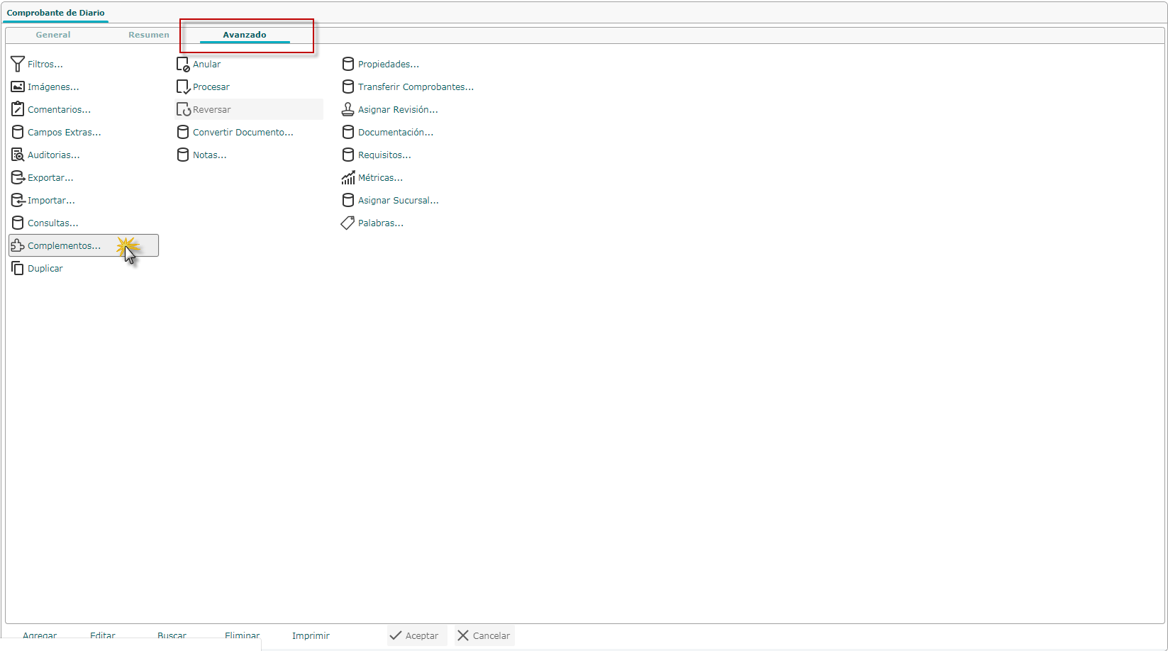 se muestra la ventana de Complementos: ComprobanteDiario, donde procedemos a
