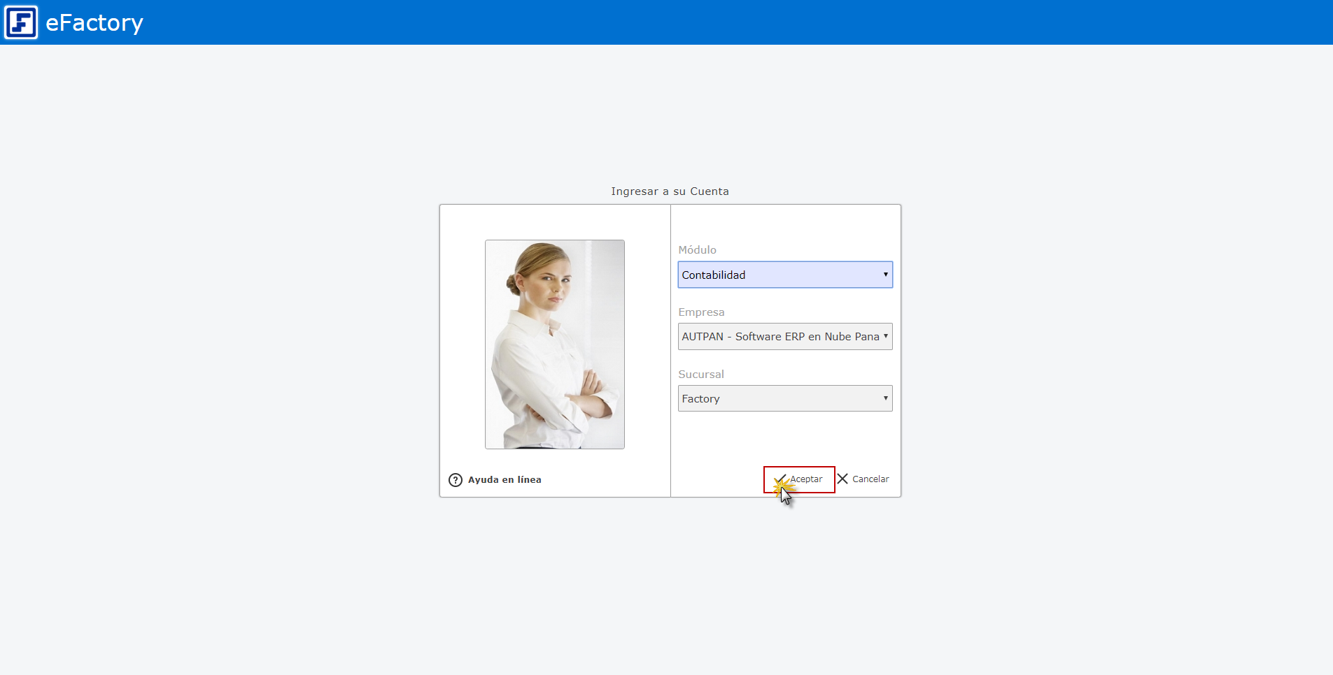 Primero deberemos ingresar a eFactory con nuestro usuario y contraseña, presionaremos "Iniciar Sesión" y luego seleccionaremos el sistema "Contabilidad", Empresa y Sucursal de la Empresa
