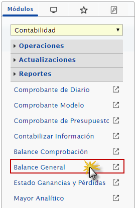 b. Para emitir un balance general tenemos que ubicar el módulo de Contabilidad, desplegamos el componente Reportes, activamos el maestro Balance General.