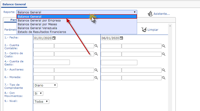 a. Se nos desplegara un panel en el cual deberemos abrir la lista desplegable en ella seleccionaremos el reporte "Balance General"